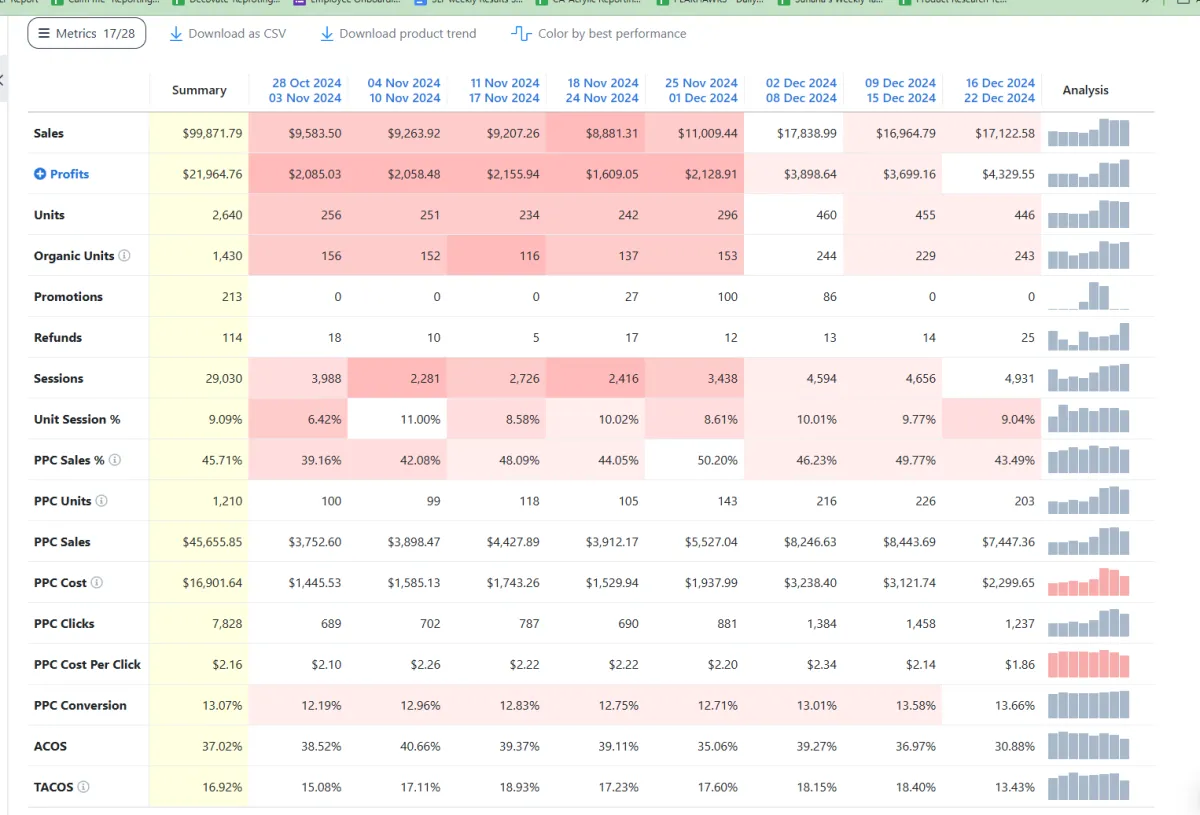 Every partnership begins with clearly defined performance benchmarks. Most commonly, we track TACOS trends, contribution margin impact, revenue growth, and SKU-level scalability.